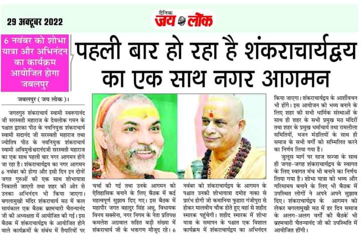अनन्त श्रीविभूषित ज्योतिष्पीठाधीश्वर एवं द्वारकाशारदापीठाधीश्वर ब्रह्मलीन जगद्गुरु शंकराचार्य स्वामीश्री स्वरूपानन्द सरस्वती जी महाराज जी के ब्रह्मलीन होने के उपरांत उनकी इच्छा अनुसार द्वारका शारदापीठाधीश्वर जगद्गुरु शंकराचार्य स्वामी श्री सदानन्द सरस्वती महाराज जी एवं ज्योतिष्पीठाधीश्वर जगद्गुरु शंकराचार्य स्वामिश्रीः अविमुक्तेश्वरानन्दः सरस्वती महाराज जी का 6 नवंबर दिन रविवार को संस्कारधानी में हो रहे प्रथम आगमन की तैयारी को लेकर दिनांक 29/10/ 22 दिन शनिवार को श्री बगलामुखी सिद्ध पीठ शंकराचार्य मठ सिविक सेंटर मढ़ाताल जबलपुर में शाम 5:00 बजे ब्रह्मचारीश्री चैतन्यानंद जी महाराज के अध्यक्षता में विशेष बैठक आयोजित की गई है जिसमें शहर के समस्त गणमान्य नागरिक, समाज सेवी, समस्त व्यापारी संघ एवं समस्त एसोसिएशन के समस्त प्रमुख पदाधिकारी उपस्थित रहें।आयोजन समितियों ने उपस्थिति की अपील की है।