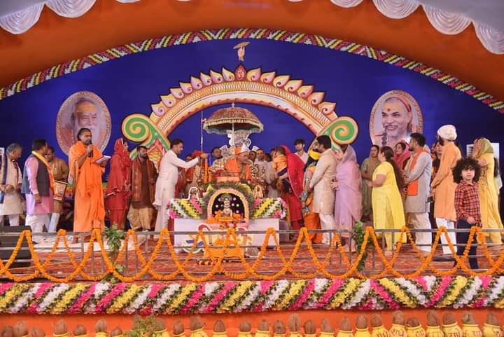 बेमेतरा। ‘परमाराध्य’ परमधर्माधीश उत्तराम्नाय ज्योतिष्पीठाधीश्वर जगदगुरु श्रीश्री शंकराचार्य जी स्वामिश्रीः अविमुक्तेश्वरानन्दः सरस्वती ‘1008’ अपने प्रवास के अष्टम दिवस दिन बुधवार को बेमेतरा के कृष्णा विहार स्थित निवास पर प्रातः भगवान श्री चंद्रमौलेश्वर की पूजा कर दीक्षार्थियों को दीक्षा पश्चात दर्शन। शंकराचार्य मीडिया के मीडिया प्रभारी अशोक साहू ने बताया शंकराचार्य जी बेमेतरा के कृष्णा विहार कॉलोनी स्थित शंकराचार्य निवास से दोपहर 11 बजे कथा स्थल पहुँचे जहाँ सुरेंद्र कुमार छाबड़ा एवं परिवार द्वारा श्रीभागवत भगवान की आरती व पदुकापुजन कर अष्टम दिवस का कथा प्रारम्भ कराया।
