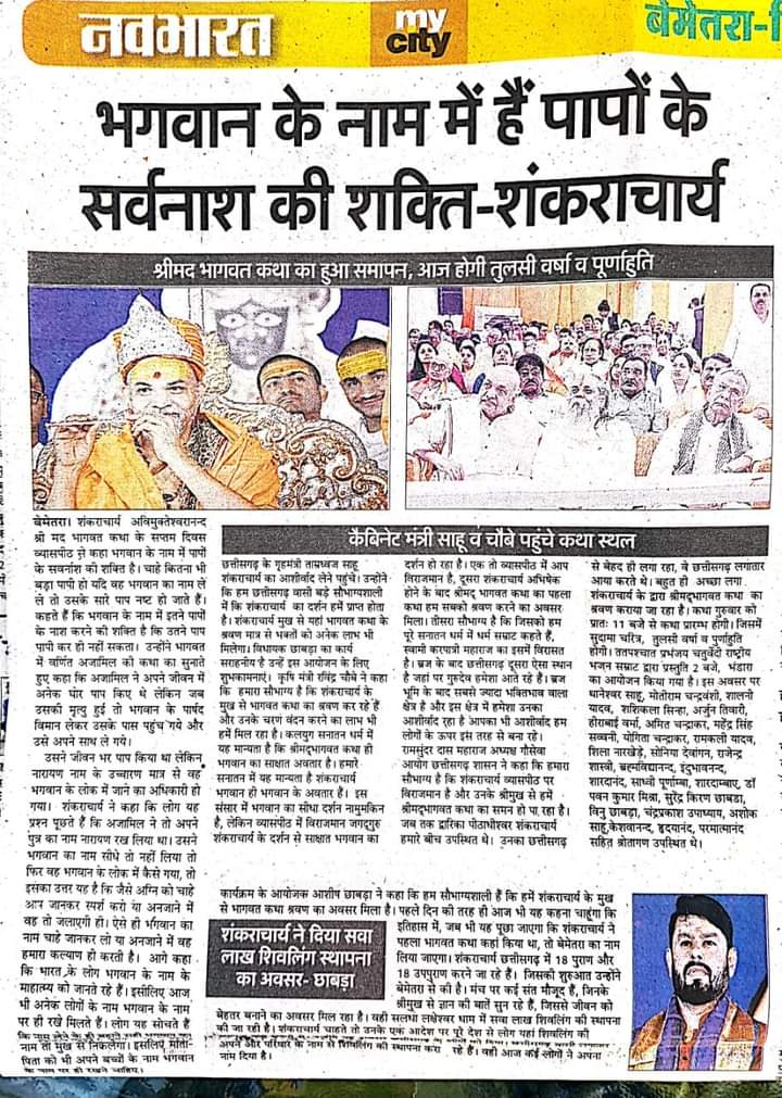 उक्त उद्गार छत्तीसगढ के बेमेतरा जिले में आयोजित श्रीमद्भागवत सप्ताह ज्ञान यज्ञ के अवसर पर ‘परमाराध्य’ परमधर्माधीश उत्तराम्नाय ज्योतिष्पीठाधीश्वर जगद्गुरु शंकराचार्य स्वामिश्रीः अविमुक्तेश्वरानन्दः सरस्वती महाराज ‘1008’ ने कही।